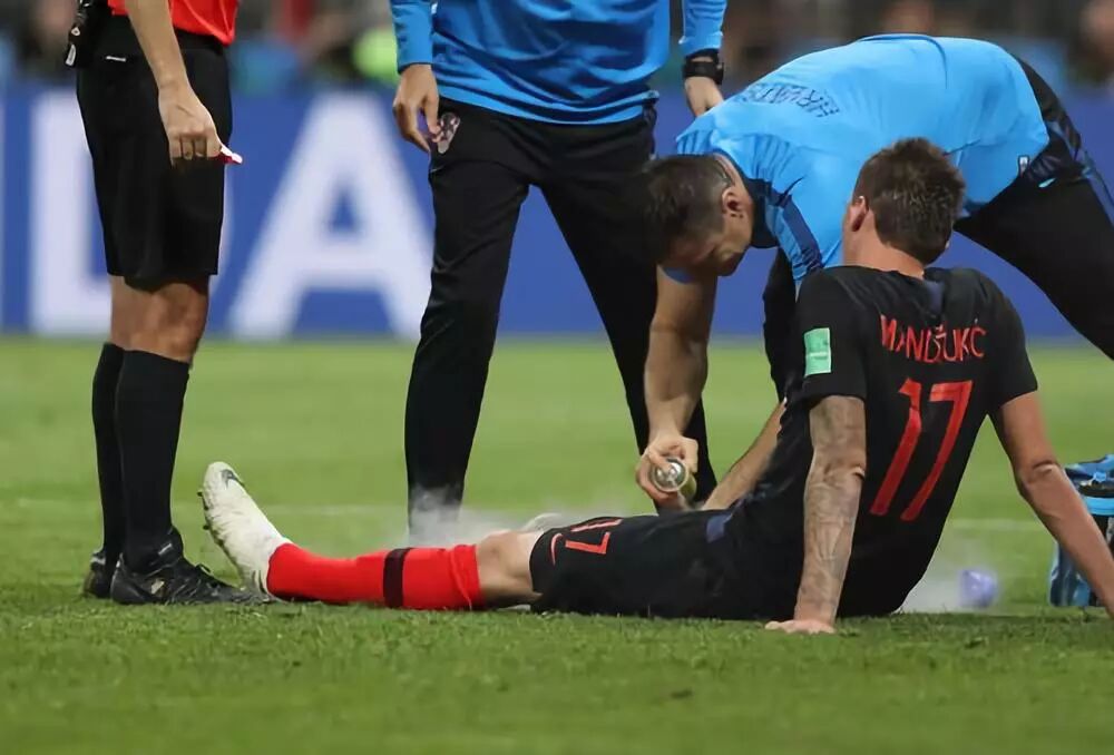 7月11日,克罗地亚队球员曼朱基奇(右一)在比赛中接受治疗。新华社记者徐子鉴摄
