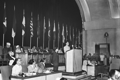 人类命运共同体是习近平外交思想的核心表述,继承和发展了新中国重大外交思想。人类命运共同体,被联合国写入有关决议,为解决人类问题提供中国方案和中国智慧。图为周恩来总理在万隆会议上发表演说。万隆会议通过的十项原则是在和平共处五项原则基础上提出的,而和平共处五项原则最先是周恩来总理提出的。和平共处五项原则提出后,被越来越多的国家、国际组织和国际会议所承认和接受,并载入了包括联合国大会通过的宣言在内的一系列重要国际性文件,对推动国际关系朝着正确方向发展,发挥了重大历史性作用。