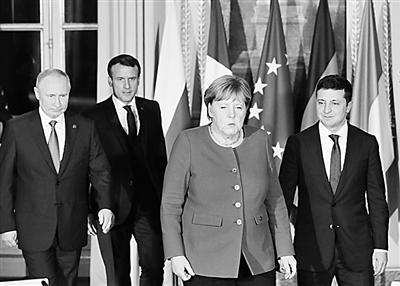 12月9日,俄罗斯总统普京、法国总统马克龙、德国总理默克尔和乌克兰总统泽连斯基在法国巴黎出席“诺曼底模式”四国峰会。