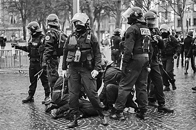 12月17日,法国全国大罢工持续。图为警察在法国北部城市里尔示威游行现场警戒。