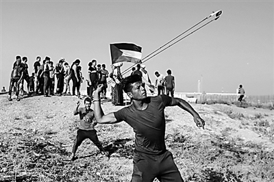 8月23日,在加沙地带与以色列交界地区,巴勒斯坦示威者向以色列士兵投掷石块。新华社发