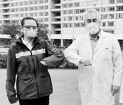 中国医疗专家组在秘鲁分享抗疫经验。图为中国医疗专家组组长郭怡与秘鲁雷瓦利亚蒂医院院长弗伦齐“碰肘”致意。新华社发