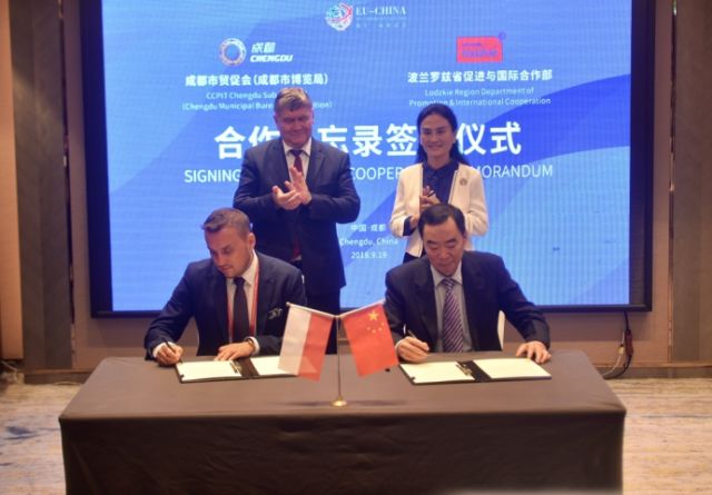 成都市博览局副巡视员李进与罗兹省促进与国际合作部部长马切伊·拉斯基签署合作备忘录。