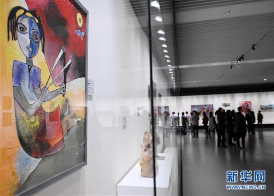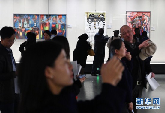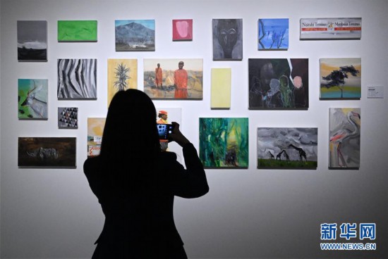 10月24日,观众在参观非中艺术交流展。 当日,首届“一带一路”非中艺术交流展暨非中文化论坛在中国国家图书馆举行。本次展览以“走进肯尼亚·感知新非洲”为主题,参展的110余幅作品中有近一半出自40余位非洲艺术家之手。参加非中文化论坛的嘉宾围绕深化“一带一路”倡议下的非中文化交流进行了发言。 新华社记者陈晔华摄