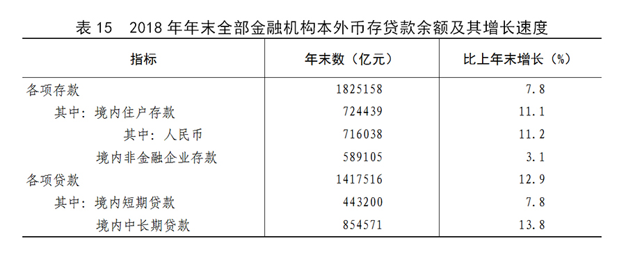 表15:2018年年末全部金融机构本外币存贷款余额及其增长速度 新华社发