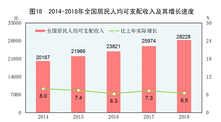 图18:2014-2018年全国居民人均可支配收入及其增长速度 新华社发