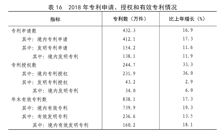 表16:2018年专利申请、授权和有效专利情况 新华社发
