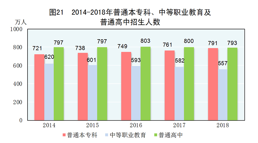 图21:2014-2018年普通本专科、中等职业教育及普通高中招生人数 新华社发