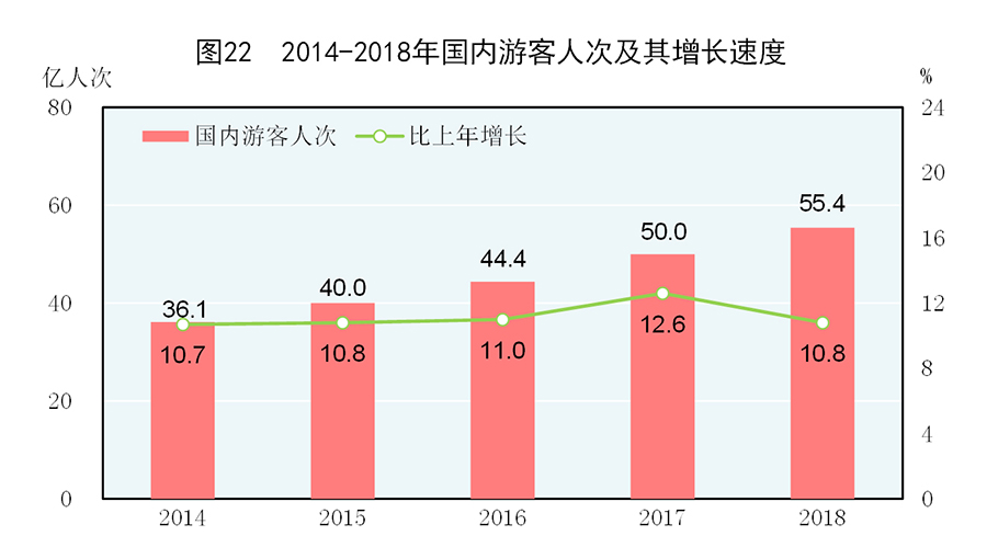 图22:2014-2018年国内游客人次及其增长速度 新华社发