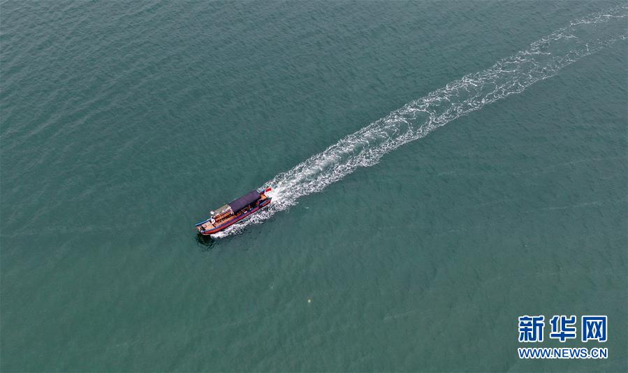 一艘游船行驶在防城港金滩海域(4月16日无人机拍摄)。新华社记者张爱林摄
