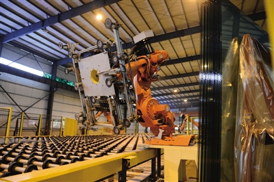 图为机器人在江西樟树宏宇能源公司的生产线上搬运玻璃制品。 记者 周密 摄