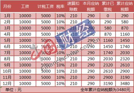 从上表可以看到,其他条件不变,累计预扣法改成按月代扣代缴之后,小明每月需要缴纳个税290元,全年要缴纳个税3480元,跟累计预扣一样。