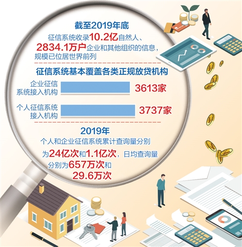中国人民银行征信中心负责建设、运行和维护的全国集中统一的企业和个人征信系统(即金融信用信息基础数据库),是国家金融基础设施的重要组成部分。数据显示,截至2019年底,征信系统收录10.2亿自然人、2834.1万户企业和其他组织的信息,规模已位居世界前列;个人和企业征信系统分别接入机构3737家和3613家,基本覆盖各类正规放贷机构;2019年,个人和企业征信系统累计查询量分别为24亿次和1.1亿次,日均查询量分别为657万次和29.6万次。