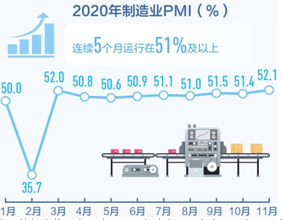 11月中国制造业采购经理指数(PMI)为52.1%,较上月上升0.7个百分点,创年内高点。