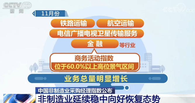 中国物流与采购联合会、国家统计局还同步公布了11月份非制造业采购经理指数,其中反映非制造业整体运行状况的商务活动指数较上月小幅回升,连续4个月位于55.0%以上的较高景气区间。