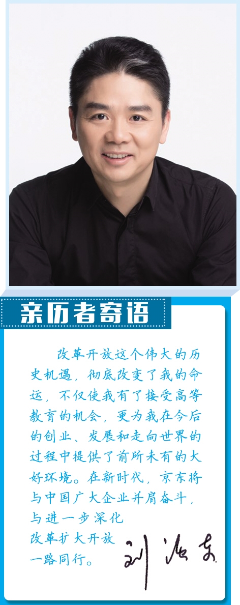 是改革开放,让这位来自苏北农村贫困家庭的孩子得以接受高等教育,走进名校殿堂,彻底改变自己的命运;也是改革开放,让他有机会施展才华、实现理想。从1998年中关村4平方米的柜台起家,到如今把京东发展成为中国家喻户晓的互联网企业,刘强东感慨地说:“京东和我本人既是改革开放的参与者,也是改革开放的受益者,我愿意继续为改革开放贡献自己的力量。”