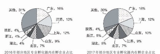 和2016年相比,专业孵化器数量较多的9个地区(广东、上海、山东、江苏等)占全国比重不断上升,其他地区的专业孵化器数量占比从28%下降到26%,说明专业孵化器数量呈现区域集聚的趋势。