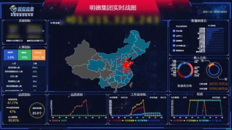 明德集团在行业内率先提出了“管理数字化、服务专业化、流程标准化、操作机械化”的管理理念,致力于打造“明德云管理平台”。指挥系统模块的搭建,实现了公司总部与各服务中心的远程对接。明德集团战图实现实时数据可视化,并实现多维度数据分析,为科学决策提供了技术支持。