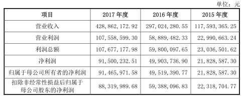 2014年至2017年,罗博特科实现营业收入分别为1956.09万元、1.18亿元、2.97亿元和4.29亿元,实现归属于母公司所有者的净利润分别为-515.72万元、2182.86万元、 4951.94万元、9146.60万元。