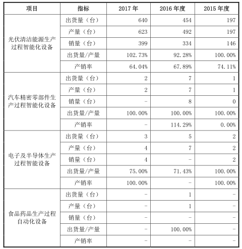 罗博特科光伏清洁能源生产过程智能化套设备产销率与产量不完全匹配。2015年至2017年,该产品产量上升,分别为197台、492台、623台,产销率逐年下降,分别为74.11%、67.89%、64.04%。