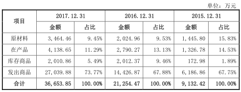 2016年末公司存货中原材料、在产品和发出商品比2015年末分别增长了40.06%、110.30%和133.19%,2017年末公司存货中原材料、在产品和发出商品比2016年末分别增长了71.09%、48.32%和87.43%,主要是由公司在执行订单数量增加而引起的。