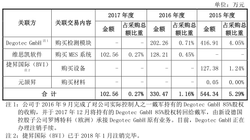 2015年,罗博特科向捷昇国际(BVI)采购了127.38万元的设备;2015年和2016年1-9 月,罗博特科因客户对所定制产品功能模块的需求,分别向Degotec GmbH采购了416.91 万元、202.26万元的检测模块用于自身产品的生产;2016年和2017年,公司分别向维思凯软件采购128.21万元和102.56万元的MES系统软件。