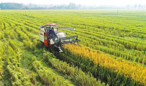 11月28日,全国水稻绿色高质高产核心试验示范区——安徽庐江县郭河镇北圩生态农场的大田里,收割机正在收割单季稻粳杂优质水稻。