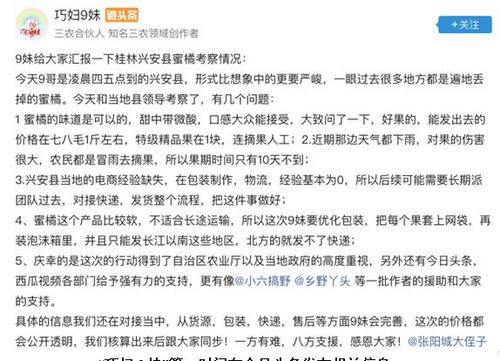 “我也是果农,我知道果农们种植水果是很辛苦的,整天在果地里面日晒雨淋,有干不完的活,还要承担‘靠天吃饭’的风险。要是天气不好,水果烂在地里,一年的辛苦就全白费了。现在,我们通过今日头条、西瓜视频积累了粉丝,也积累了电商经验,有能力帮助果农们销售水果。更何况,桂林兴安县是革命老区,有几十个贫困村有几千名贫困户,这个时候我们义不容辞。”“巧妇9妹”说。