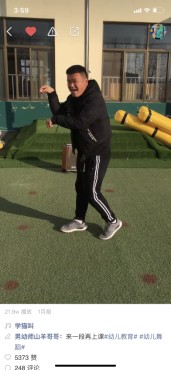 视频男主角叫“山羊哥哥”,是江苏连云港赣榆县的一名乡村男幼师。他经常把自己教小朋友跳舞的视频发到快手上:看似肉嘟嘟的他用力把每一个动作做到位、每一步都踩在节拍上,表情也是精准而丰富。