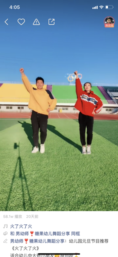 幼师“糖果哥哥”凭借自创的幼儿舞蹈视频在快手上收获了122万粉丝,还在快手课堂开了课——其中,《中国范儿》和《卡路里》最受欢迎。