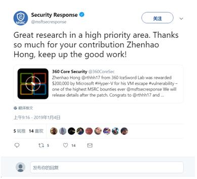 中新网1月7日电 2019年伊始,微软送出了史上最高一笔漏洞挖掘奖励,总额高达20万美元(约合人民币137万)的奖金,奖励360冰刃实验室研究员洪祯皓发现的一个Hyper-V的漏洞,正值国内年终岁末,可谓是微软送给中国白帽黑客一笔丰厚的“年终奖”。由于漏洞危险级别高,影响范围广,微软在确认漏洞细节后第一时间确认奖金并致谢漏洞发现者。