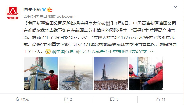 中国网财经1月7日讯 据国资委官方微博消息,1月6日,中国石油新疆油田公司在准噶尔盆地南缘下组合在新疆乌苏市境内的风险探井—“高探1井”发现高产油气流。解锁了“日产原油1213立方米”、“发现天然气32.17万立方米”等世界级难度成就。高探1井的重大突破,证实了准噶尔盆地南缘前陆大型油气富集区,勘探潜力十分巨大。
