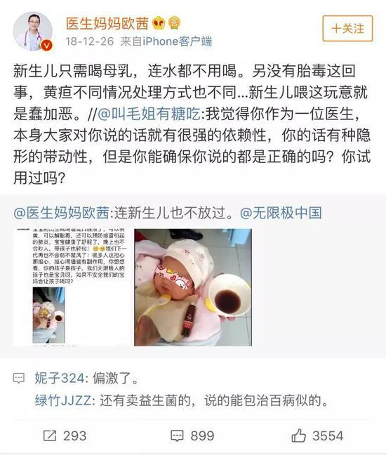对此,欧茜称:“新生儿只需喝母乳,连水都不用喝,并且没有胎毒一说,给新生儿吃这个就是蠢加恶。”