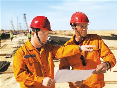 图为刘鹤君(左)与埃及助理一道,按设计图纸检查工程进度。
