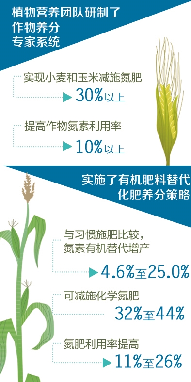 此外,植物营养团队建立了养分推荐方法,应用计算机软件技术,研制了作物养分专家系统,实现了4R(肥料用量、品种、施肥时期、施肥位置)养分管理,实现小麦和玉米减施氮肥30%以上,提高作物氮素利用率10%以上。团队还实施了有机肥料替代化肥养分策略,与习惯施肥比较,氮素有机替代增产4.6%至25%,可减施化学氮肥32%至44%,氮肥利用率提高11%至26%,为化肥减施增效提供了有效技术途径。