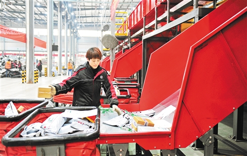 1月29日,顺丰快递湖北省宜昌市夷陵区处理中心员工对分类传输流水线上的快件进行分拣。 张国荣摄(中经视觉)