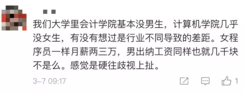 不过,也有网友冷静地指出,两性之间整体薪酬差异也有客观原因存在。