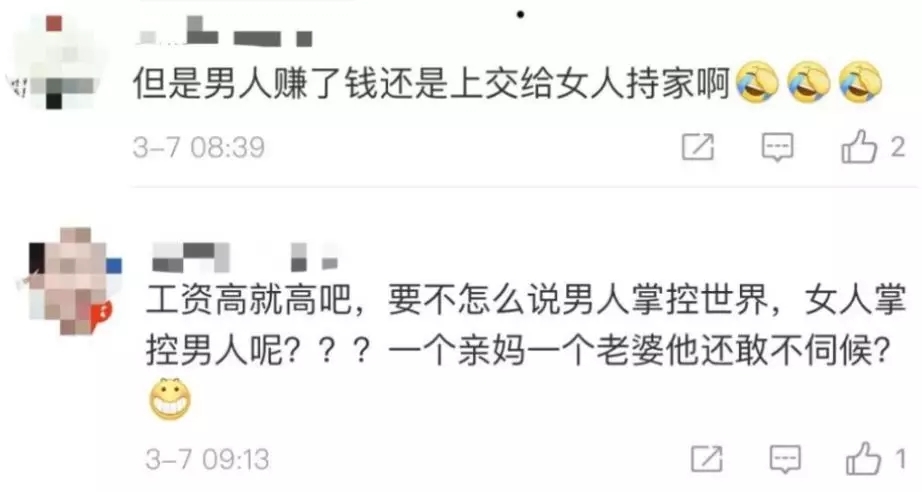 也有幽默的网友出来“和稀泥”说,反正男生挣的钱最后也得回家交给女生…