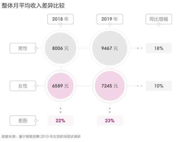 从数据来看,2019年男性月平均收入为9467元,同比增长了18%,而女性月平均收入为7245元,仅增长10%。