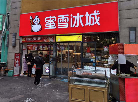 蜜雪冰城新装修的门店,没有走时下流行的性冷谈,也没有走“逼格”风,而是将“个性”审美发挥到了极致:高大的门头招牌用上显眼的红色,门头字的排版填充放大,门头灯的亮度也成为了整条街闪亮的存在。如此别具一格的装修风格,让蜜雪冰城在网红店当道的今天,成为了“另类”。