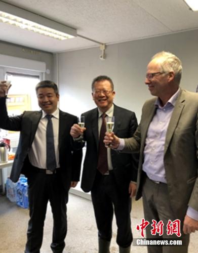(左)中国驻荷兰大使馆商务参赞张国胜,(中)汉能荷兰 CEO 李明,(右)格罗宁根副市长举杯庆祝 Solar Park Roodehaan 启用
