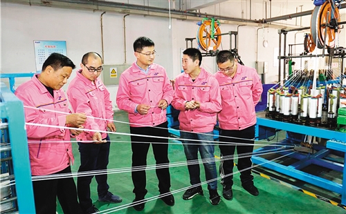 徐连龙和他的研发团队在生产车间查看绳缆编织工艺情况。