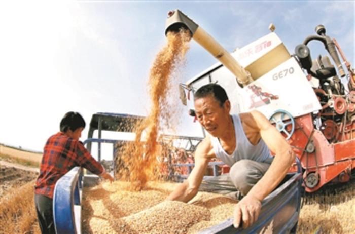5月24日,大型收割机正在山西运城盐湖区西姚村收割成熟的小麦。由于气候的原因,从5月20号开始山西南部的运城市率先开镰收割成熟的小麦,这也标志着山西夏收从南到北将陆续开始。姜华 摄/中新社