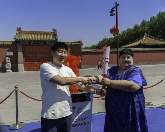 图为首届中国旗袍文化节盛京满绣火炬传递活动现场