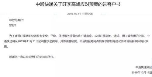 为何调价?中通快递解释,为确保旺季期间快递服务安全、平稳,保持服务质量和客户满意度,应对旺季场地、运输、用工等费用的上涨。