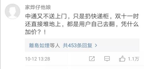 一位网友明确表态反对加价:“中通快递又不送上门,只是扔快递柜,双十一时还直接堆地上,都是用户自己去翻,凭什么加价?!”该条评论在微博上获得了超过一万的点赞数。