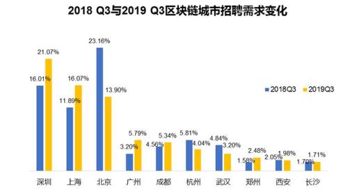 报告显示,从2019年第三季度区块链招聘需求的城市分布来看,人才需求主要集中于一线和新一线城市,与人才求职城市分布对应,且人才供给明显更集中在一线城市。
