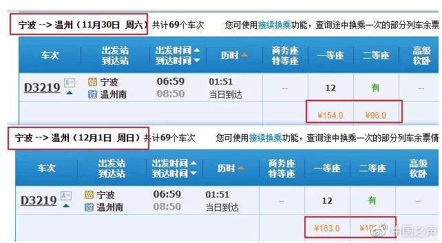 按照5.5折最低折扣,目前兰州到西安的票价为174.5元,在最低价时,或将只需96元。然而,票价也并不是都处于降价趋势,对于部分列车段而言,票价也出现了上升的情况。以宁波开往温州的G2343次列车为例,11月30日,该车的商务座288元,一等座154元,二等座96元;而12月1日,该车的票价商务座、一等座、二等座分别上涨17元、9元和6元,票价出现了小幅上涨。