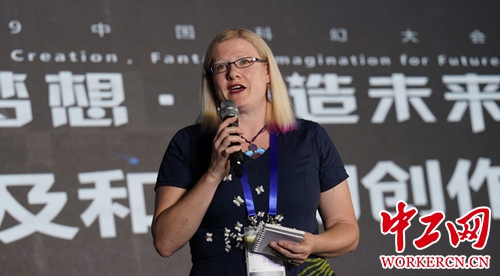 克里斯托·荷芙(Crystal Huff)女士在致辞中表示,非常高兴能与中国科幻学者交流,能见到中国青少年科普科幻创作人才感到十分兴奋,希望未来国际科幻界能有更多交流合作。