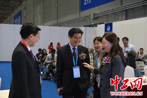 11月9日,在上海国家会展中心2.1馆内的签约交易现场,参展商和采购商热情交流,准备签约仪式。